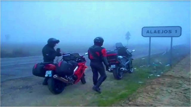 E foi piorando até que não víamos mais de 20 metros à frente das motos. Saímos para a estrada secundária mas o cenário mantinha-se nevoento. Parámos e discutimos qual a opção a tomar. Regressámos à autoestrada, fomos para a faixa da esquerda de onde só saímos em Valladolid, directamente para a Concentração.